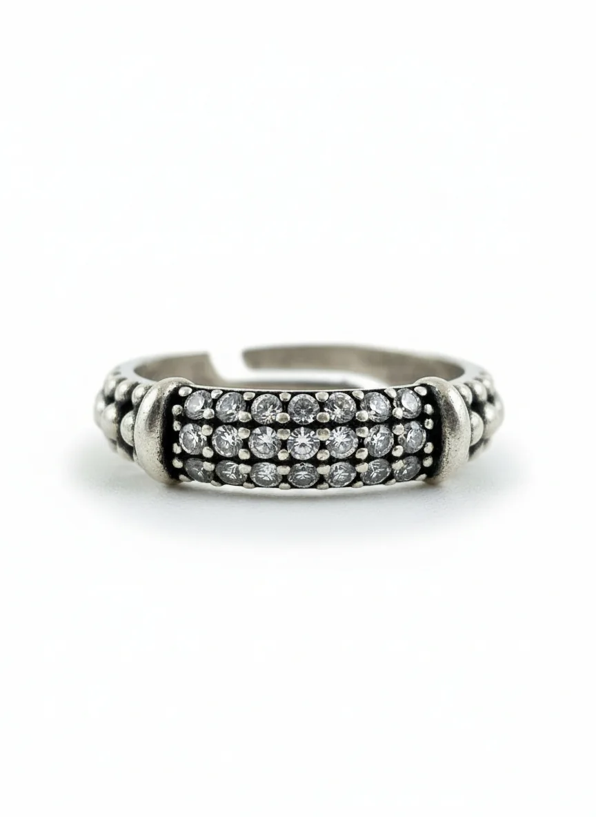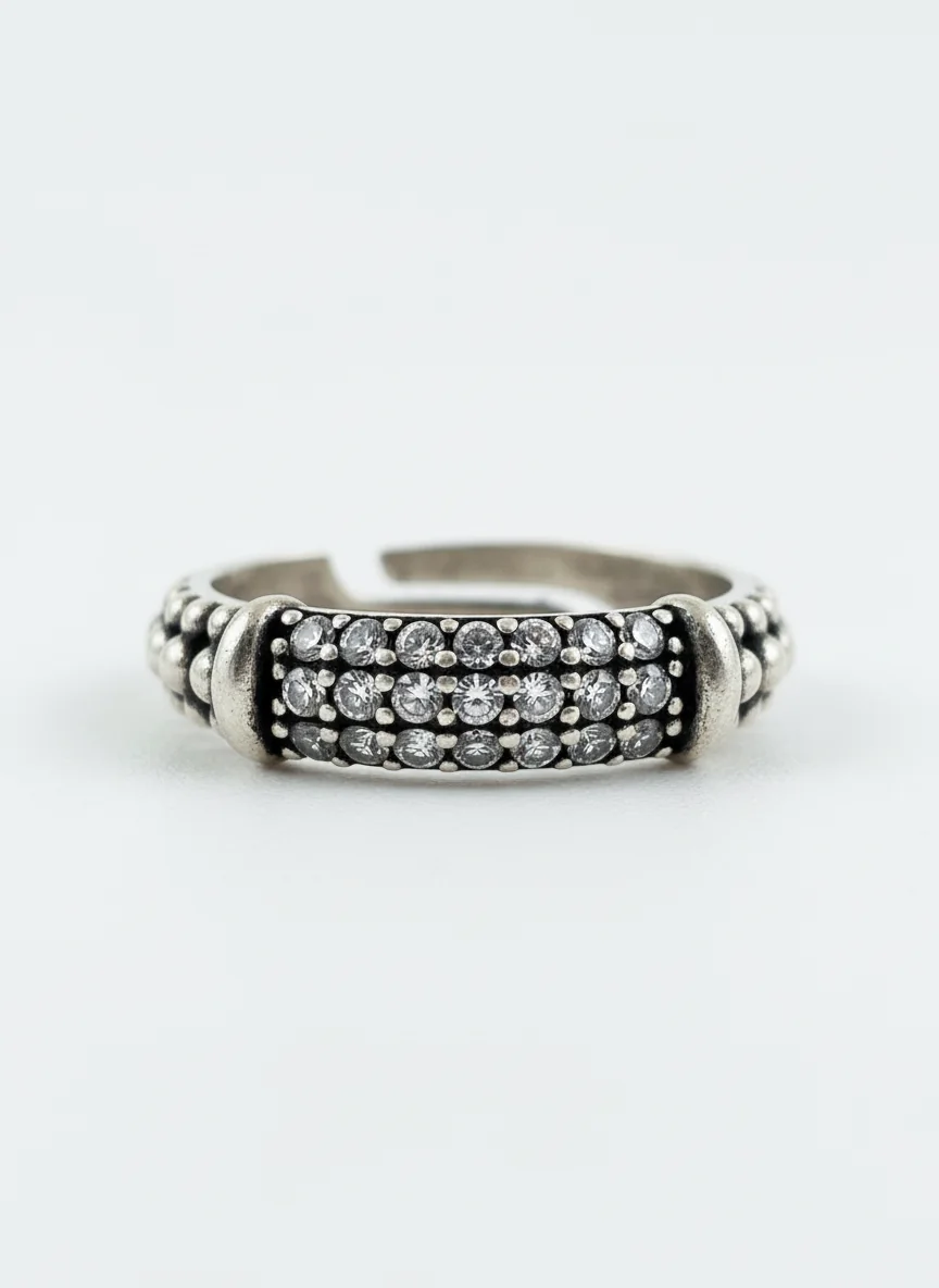 Ardelle prsten donosi snažan, ali uravnotežen izgled zahvaljujući višerednom rasporedu cirkon kamenčića i teksturiranoj srebrnoj površini. Ritmično postavljeni kameni detalji stvaraju dubinu, dok patinirani efekat metala daje dizajnu moderan i sofisticiran karakter.