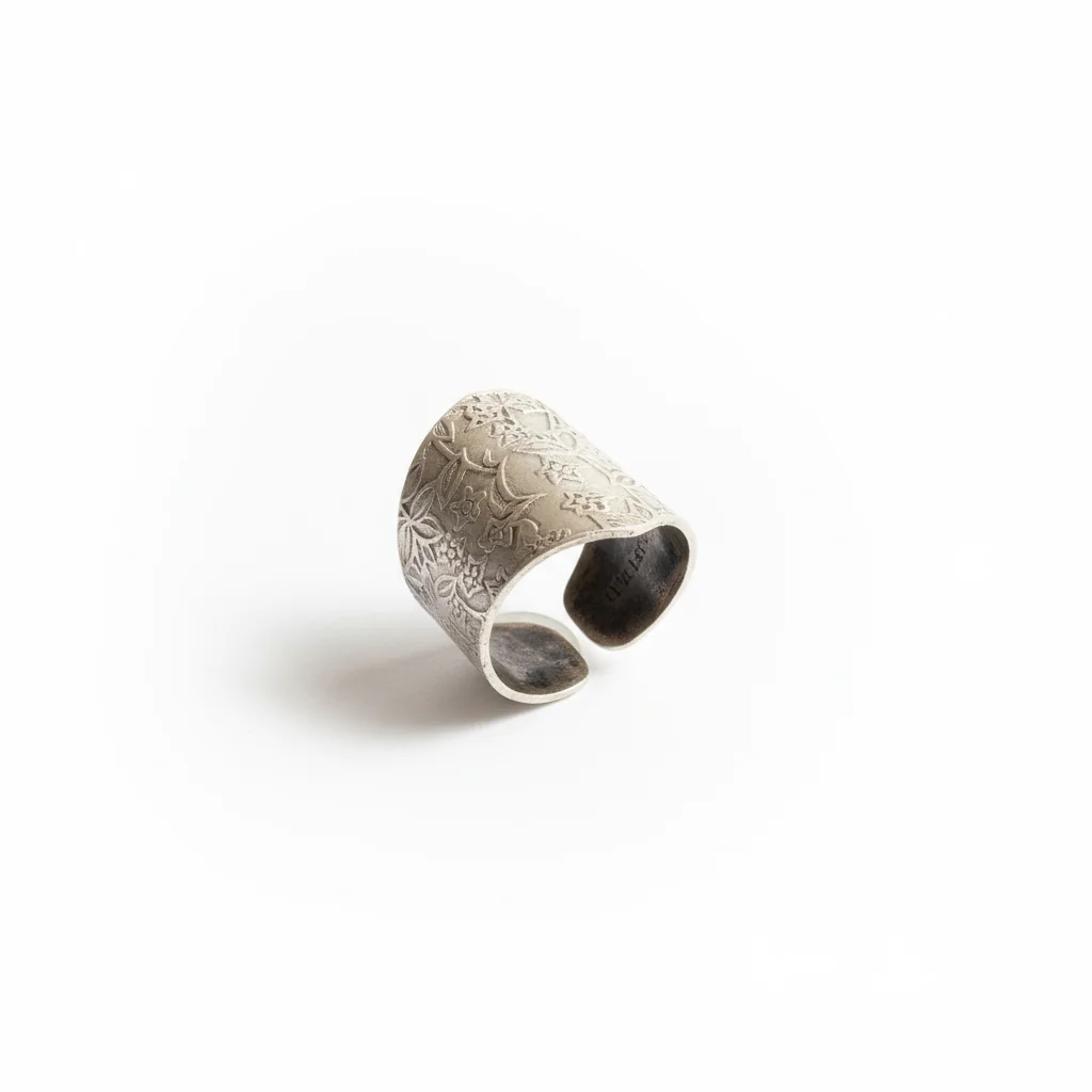 Inspirisan nežnim teksturama prirode, Ardena prsten donosi reljefne floralne motive koji kroz ručnu obradu dobijaju skulpturalni karakter. Antik srebrna završnica unosi rustičnu eleganciju i suptilnu boho estetiku.