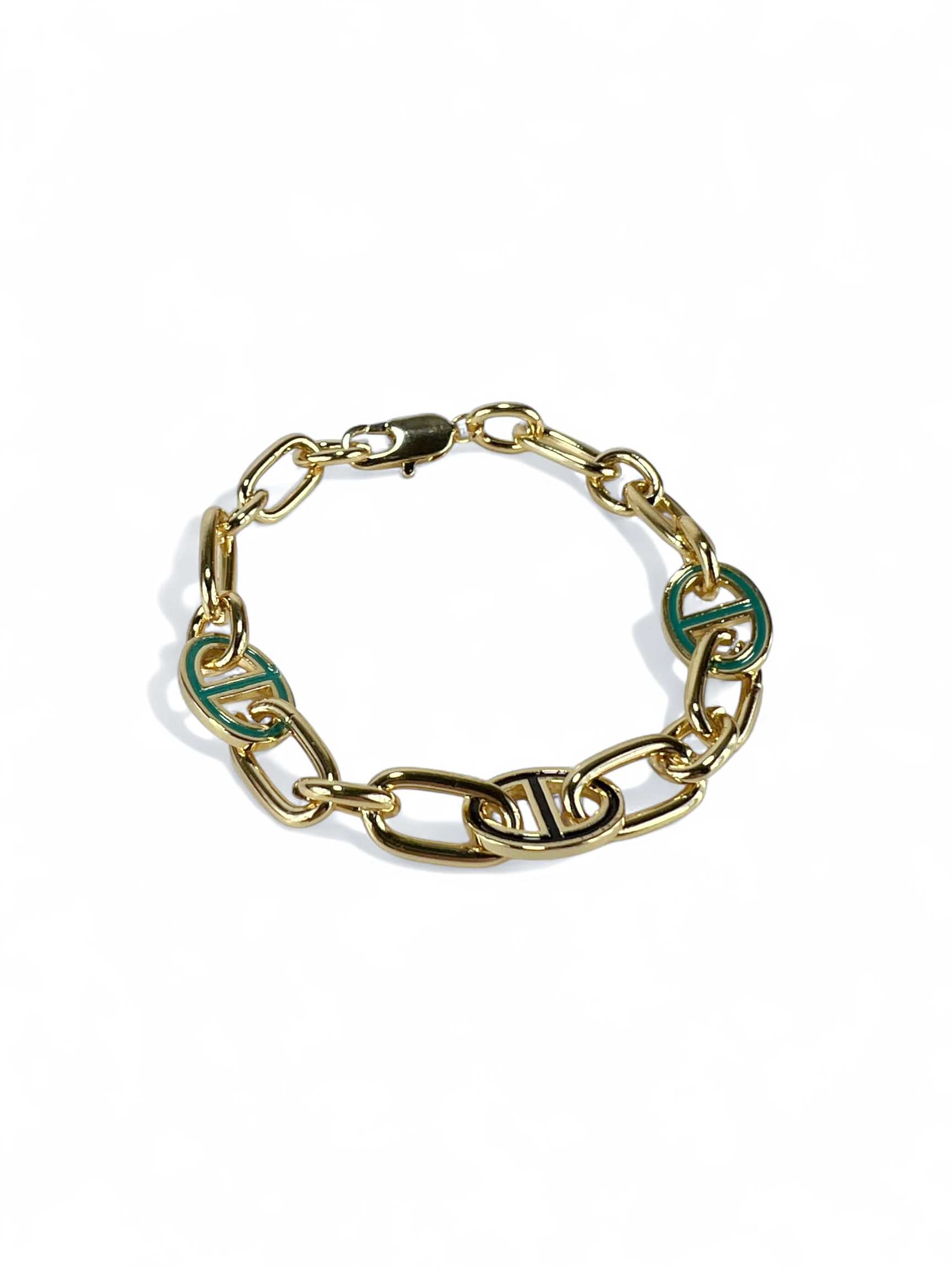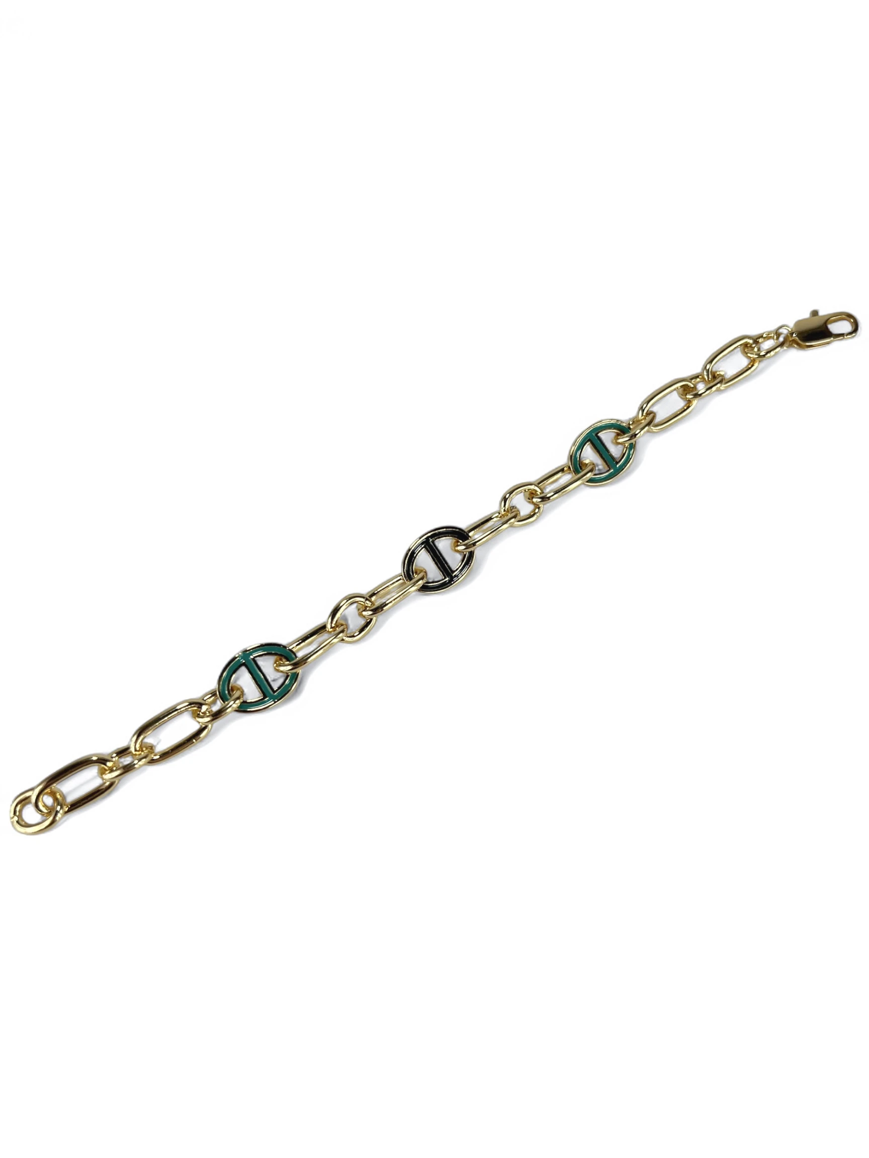 Cassia narukvica spaja moderan dizajn karika lanca sa osvežavajućim zelenim emajl detaljima. Ovaj ručno rađeni komad izrađen je od mesinga sa zlatnom presvlakom, koji pruža topao i luksuzan sjaj, dok zeleni akcent unosi energiju i živost u svaki stil. Savršeno se uklapa uz dnevne kombinacije kojima daje dinamiku, a u večernjim izdanjima donosi sofisticiran i moderan akcenat.