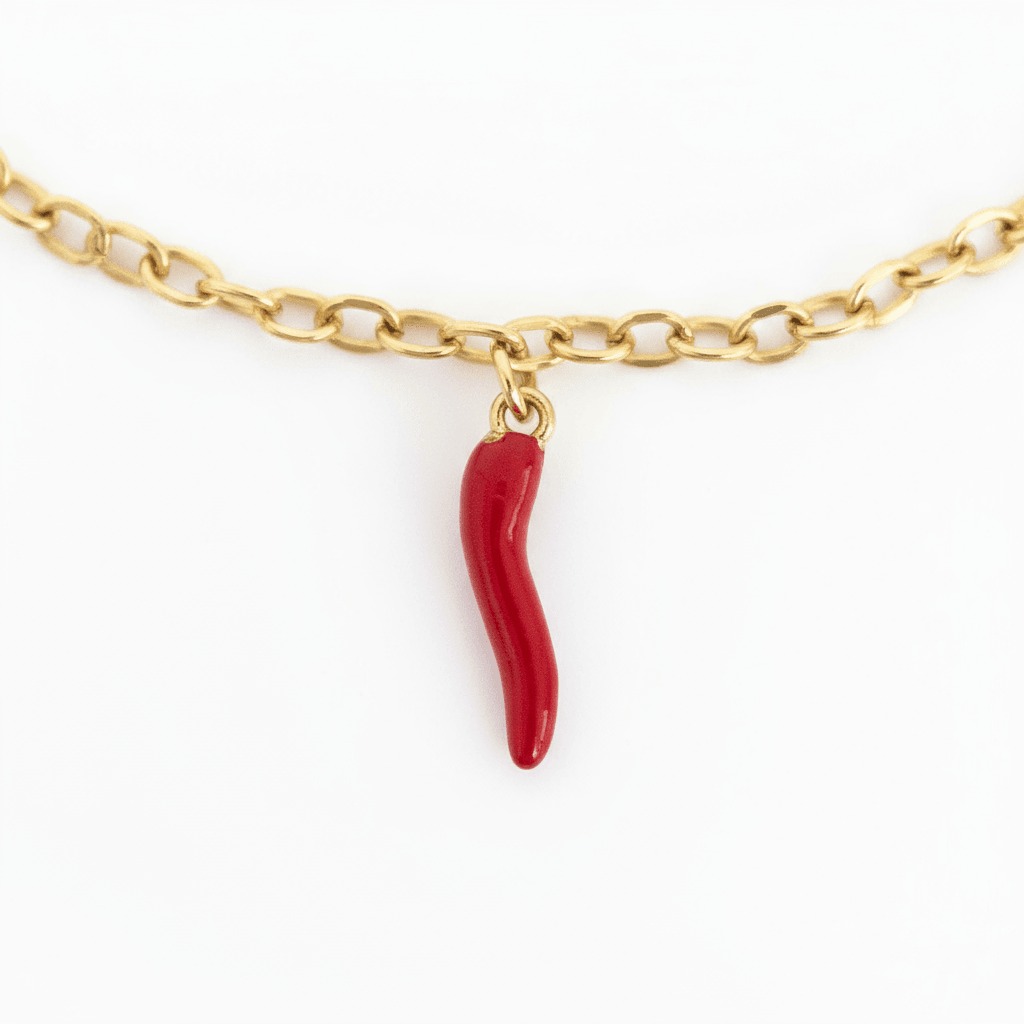 Corno ogrlica spaja jedan od najpoznatijih italijanskih amajlija – crveni rog, simbol sreće, blagostanja i zaštite od negativne energije – sa modernom elegancijom. Sjajan crveni emajl daje energičan akcenat, dok zlatni lančić pruža jednostavan, ali upečatljiv izgled. Dizajnirana je za one koji žele da svom svakodnevnom stilu dodaju simboličnu vrednost ili da nose komad koji nosi pozitivnu energiju. Minimalistička je, ali istovremeno izrazita i jedinstvena.