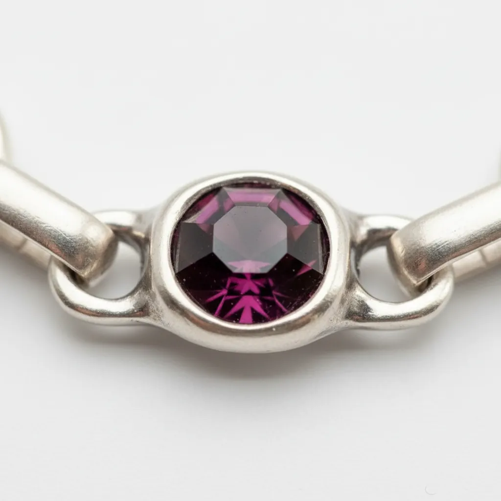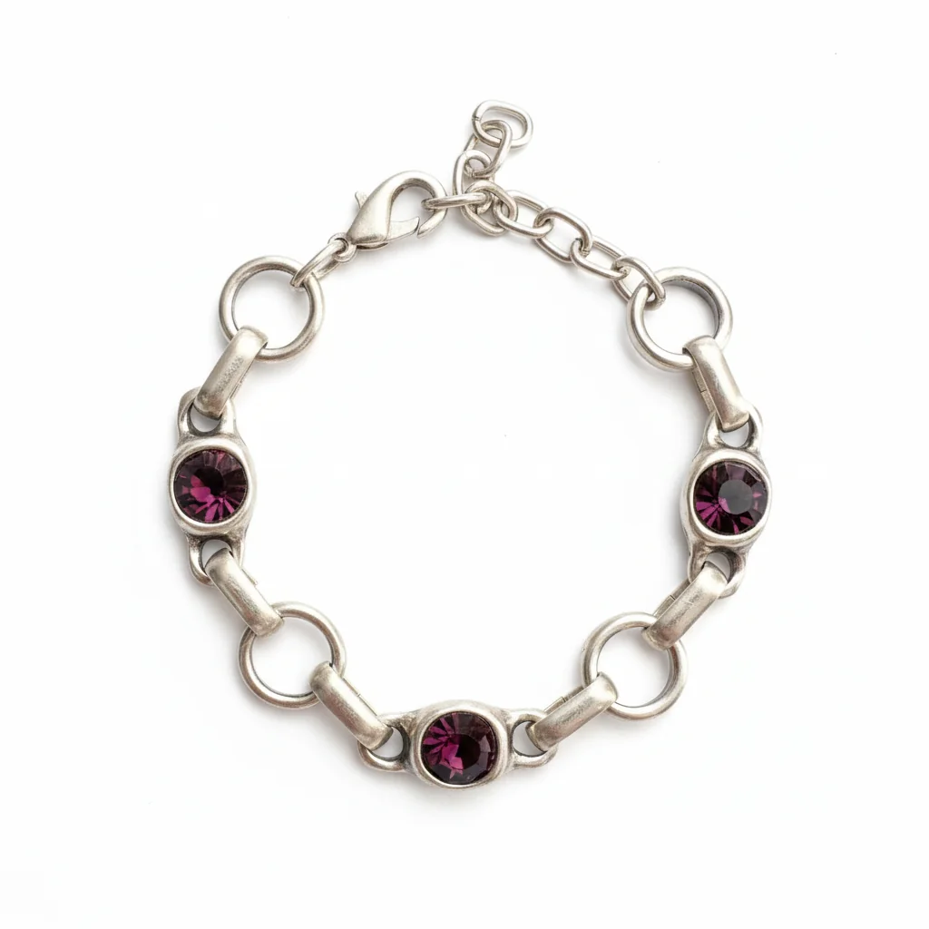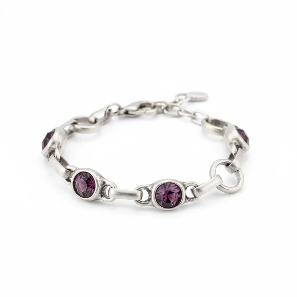 Mat srebrna završnica naglašava dubinu tamno-ljubičastih tonova, gradeći moderan kontrast i sofisticiran karakter. Zahvaljujući podesivom lancu, lako se prilagođava različitim veličinama zgloba i pruža udobno nošenje.