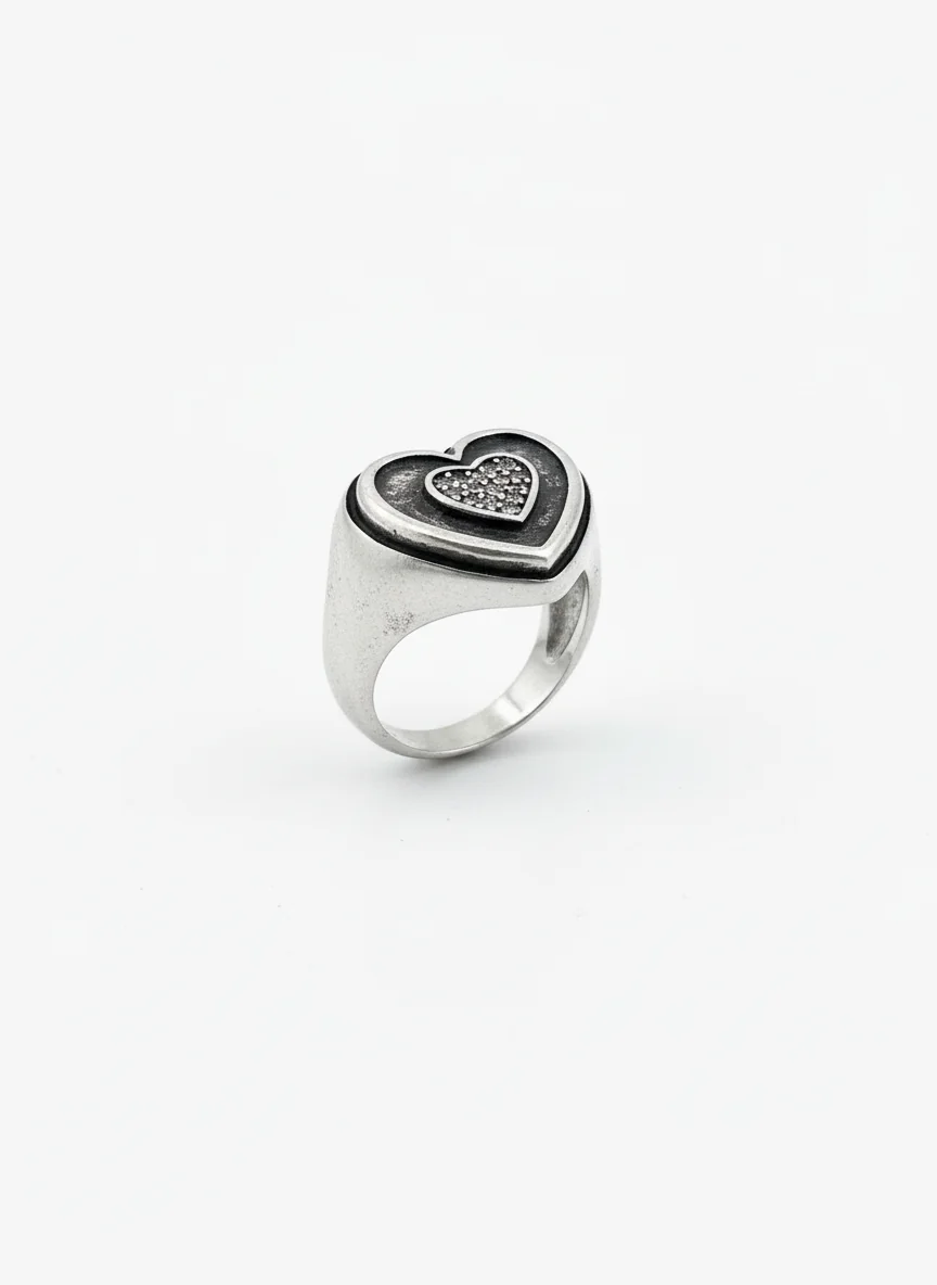 Nocté prsten spaja romantičnu simboliku sa snažnom, skulpturalnom formom. Slojeviti oblik srca i centralni cirkon stvaraju sofisticiran, ali izražajan izgled. Patinirana srebrna površina nežno reflektuje svetlost i dodaje dubinu dizajnu.