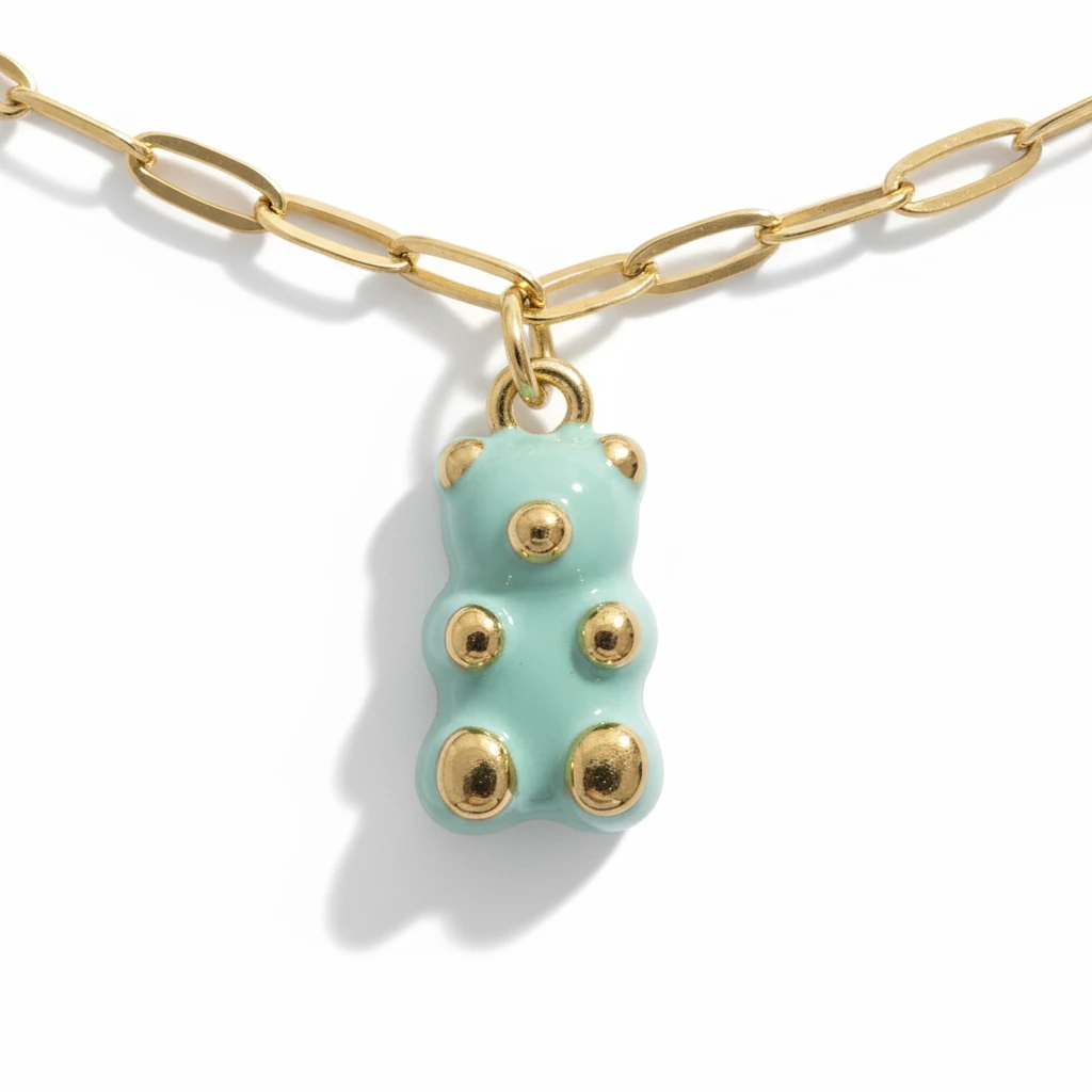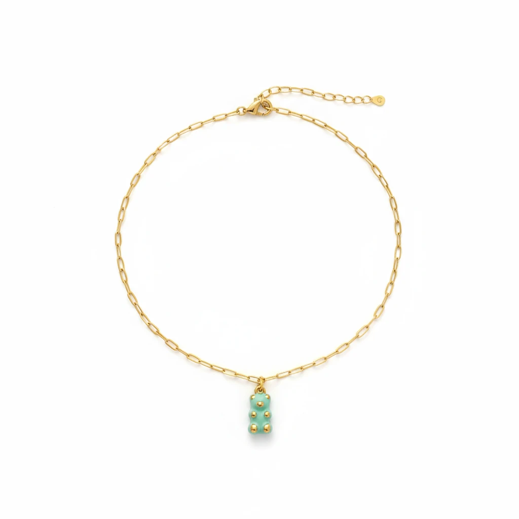 Tiraya ogrlica kombinuje nežan pozlaćen lančić sa ručno izrađenim tirkiznim priveskom u obliku malog medvedića. Moderni, ali razigrani dizajn čini ovaj komad idealnim za one koji žele suptilan, ali primetan detalj. Svaki medvedić je ručno emajliran, pa se sitne razlike mogu pojaviti, što svaku ogrlicu čini jedinstvenom i posebnom.